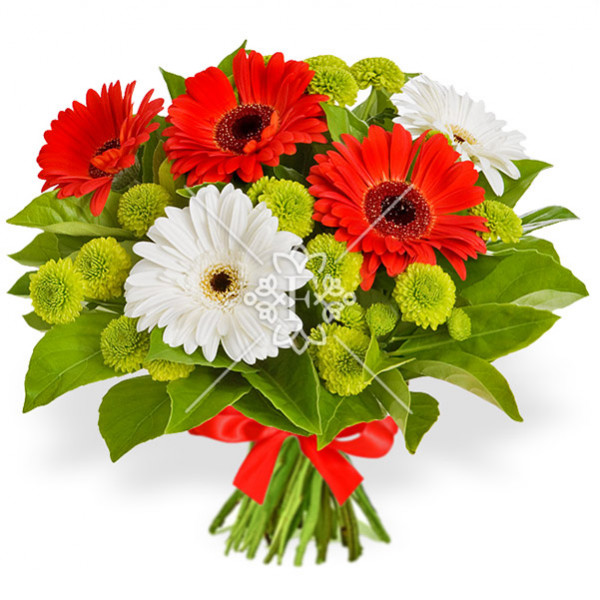 гербера белая и оранжевая - 5 шт., хризантема зеленая (сантини) - 4 шт., зелень декоративная (салал), упаковка, лента.